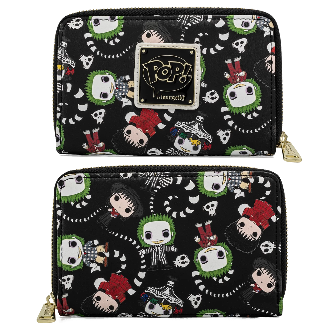 Donβt be anxious. The new Funko Pop! by Loungefly Beetlejuice Zip Around Wallet is here in time for scaring season. This patternβs all over print features Funko Pop! versions of Beetlejuice in various outfits among motifs of sandworms and skulls. This wallet is βloudβ and attention catching design making it an appealing accessory for pairing with Halloween themed outfits.