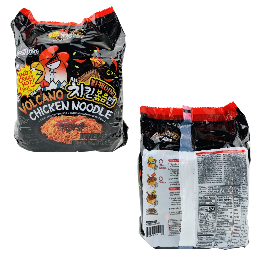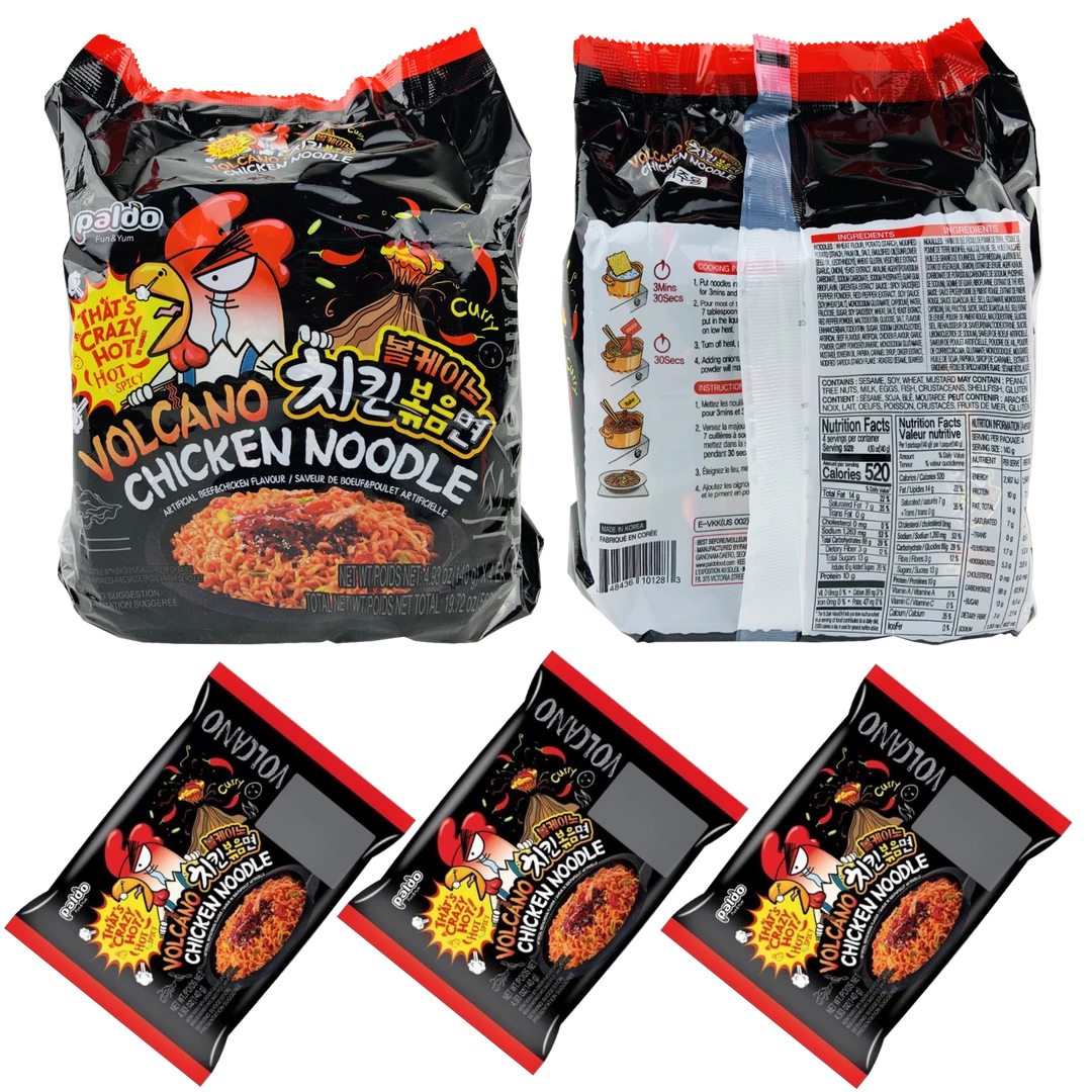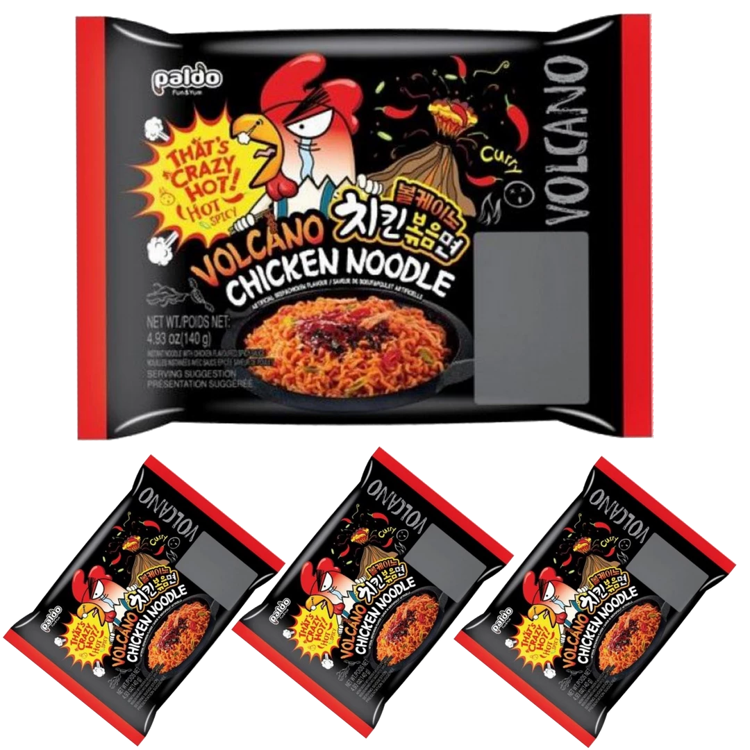 Thatβs crazy hot hot spicy volcano chicken noodle is a dry noodle with chicken flavor sauces. The noodle is thick and chewy. To prepare, put the noodle into 600ml of boiling water for 3mins and 30secs. Pour most of the water out with approximately 7 tablespoons of water remaining in the pot, put in the liquid sauce and mix for 30 seconds on low heat. Turn off the heat, put in flakes and mix well. Adding onions, shallots, garlic, and hot pepper powder will make it taster.