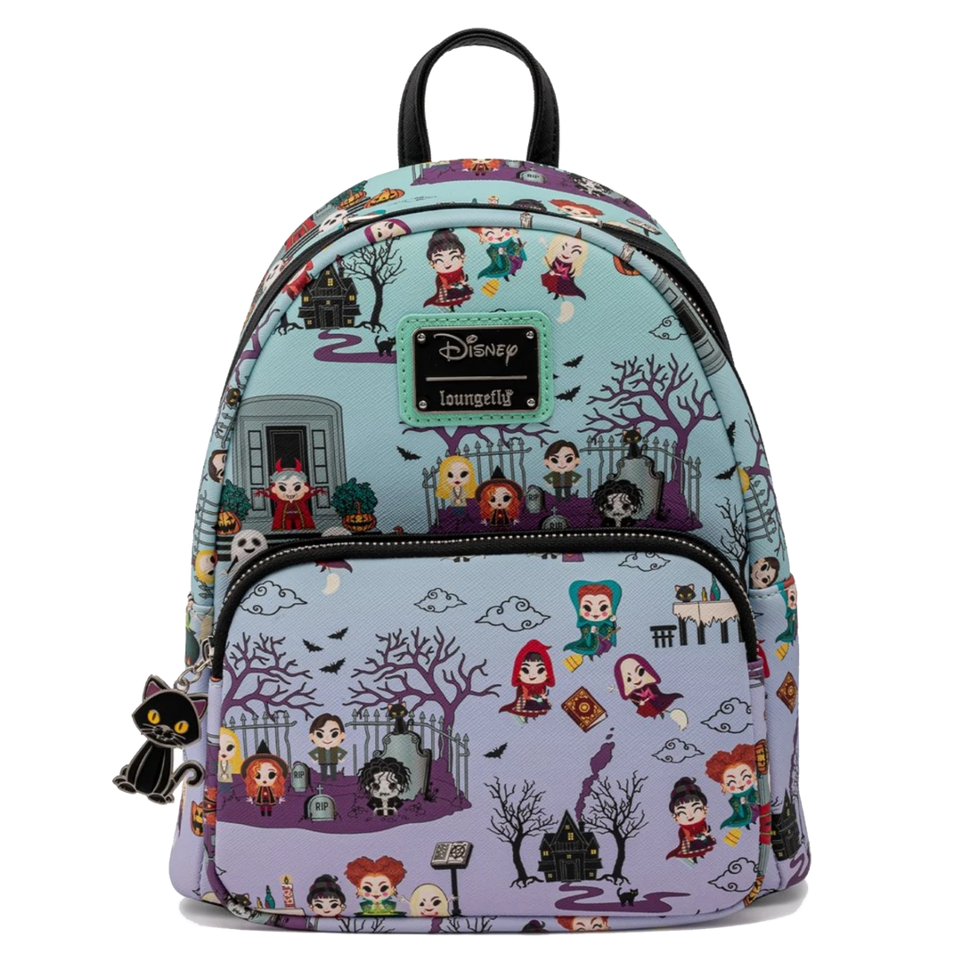 The Disney Hocus Pocus Scene Mini Backpack is made of faux leather, has a top zipper closure, adjustable shoulder straps, sturdy metal hardware, matching themed lining, and features printed details.